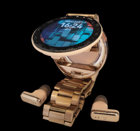 Reloj con auriculares incorporados, además de contar con un hermoso diseño en un hermoso color dorado champagne, presenta un alto grado de durabilidad en el tiempo, resistente al agua y con toda la tecnología en su interior.